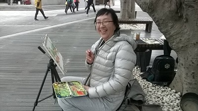 有一天她經過一家百貨公司,看到有人在教畫,她進去報名。兩年來,老師教她畫什麼,她就照著去畫。一段時間後,她覺得如此臨摹很無趣,便隨性而畫,畫好之後再請老師點評。老師說:「你都不照我教你的去畫,爲什麼還要來這裏學呢?」這讓她很失望,覺得畫畫不是退休後要走的路,於是她收起畫筆,從此不再畫了。