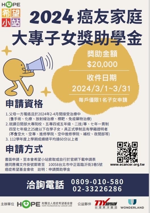 2024癌友家庭大專子女獎助學金3月開跑!